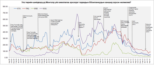 Таны харж буй график дээр сүүлийн арван жилд Монголын улс төрд өрнөсөн гол үйл явдлууд байна. Ерөнхийлөгчийн болон Парламентийн сонгуулийн дараа, ердөө маргаашнаас нь бирж дээр хувьцааны үнэ хэрхэн гулсан унаж ирснийг харагтун. 2008 оны долдугаар сарын 1-ний дараа хамгийн чанга унажээ. Түүнчлэн уул уурхайтай холбоотой улс төрийн шийдвэр үзэглэсний маргааш нь л Монгол дахь ордуудын хувьцаа нэвсийтэл буугаад ирснийг Та харлаа. Басхүү тухайн ордын үнэ цэнийг илэрхийлсэн шинэ мэдээ дэлхийн зах зээлд цацагдах мөч бүрт хувьцааны ханш эргэн өндийсөн түүхэн өдрүүдийг Та үзэж байна. Дээшээ доошоо савласан нарийн зураас болгоны завсарт олон мянган хувьцаа эзэмшигчийн хувь заяа хавчуулаастай яваа. Том хувьцаа эзэмшигч Компани, Засгийн газруудын халаасны хэмжээ ч энэ дунд хоорондоо холбоотой савлаж явна гэсэн үг.